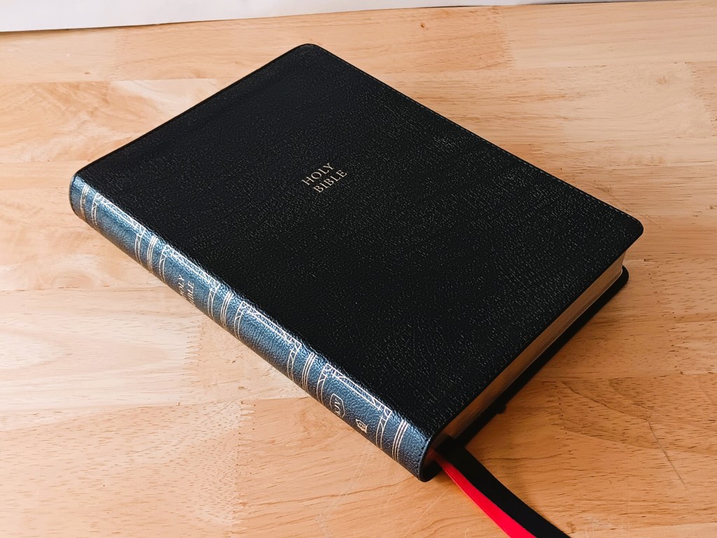Exterior: The words Holy Bible are embossed in gold on the front cover and the spine. On the spine, there are 4 decorative boxes stamped in gold. In between the boxes are 5 faux hubs also stamped in gold. The gold foil on the page edges has been evenly applied. This edition has Index tabs with 4 books printed on each tab and is also available in non-indexed. There are two 10mm wide ribbons, about 3 inches long, one black for the OT, and one red for the New Testament.